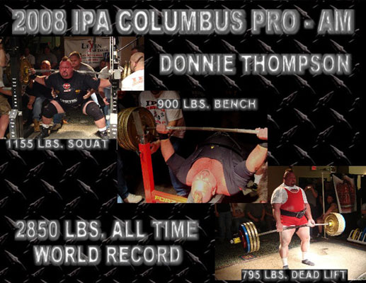 Andy Bolton posted 2806 lbs total in March of 2007. Prior to that, the seven-year reign belonged to Big Garry Frank of Baton Rouge. Still going backwards, it was Ed Coan, Dave Pasanella, Anthony Clark, Bill Kazmaier, and the original record holder was Don Reinhoudt of the early seventies. That is a total of seven very strong men. I wanted to be number eight. At this point in my Powerlifting career, I am 43 years old, trying to figure out how to do this without falling apart. I tried in November of 2006, posting a 2770 lbs total. I felt crippled for two months afterwards. I tried again in Cincinnati Ohio, August of 2007. I bombed severely but did not get hurt. November rolled around again and I posted a 2775 lbs total in York, Pa. I was one lift away from the record but denied by simple mishaps. Now back to Columbus Ohio exactly two months later. I missed my first two squat attempts. Got it together and hammered my last attempt to stay in the meet. The bench went better than expected. I needed a 755 lb deadlift to break the record. Done. I pulled 795 lb for my second to get a rounded number of 2850lbs. My back was completely fried. I could not attempt my 835 third deadlift. So I decided to end the day. All my lifetime dreams were realized at that moment. It sort of left me depressed. Competition is the key ingredient to my soul. That is living to me. Boy, have I lived.